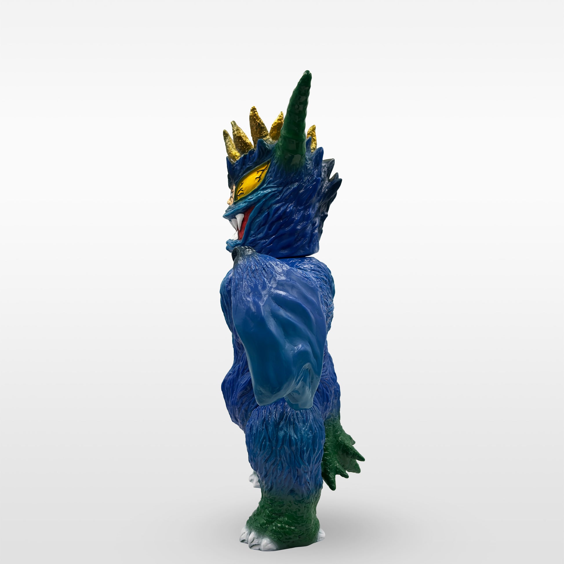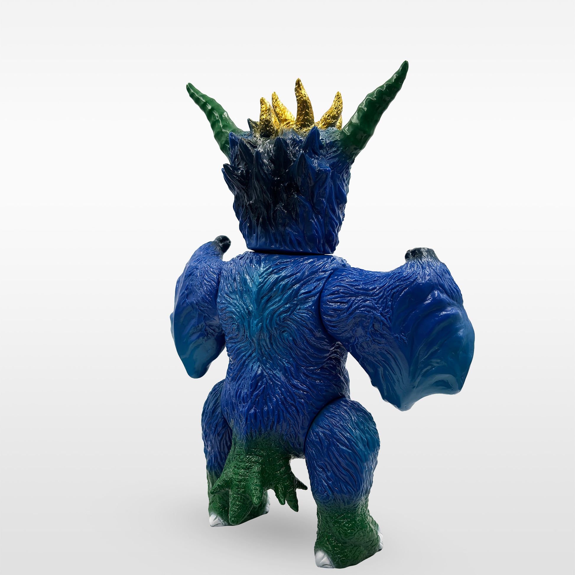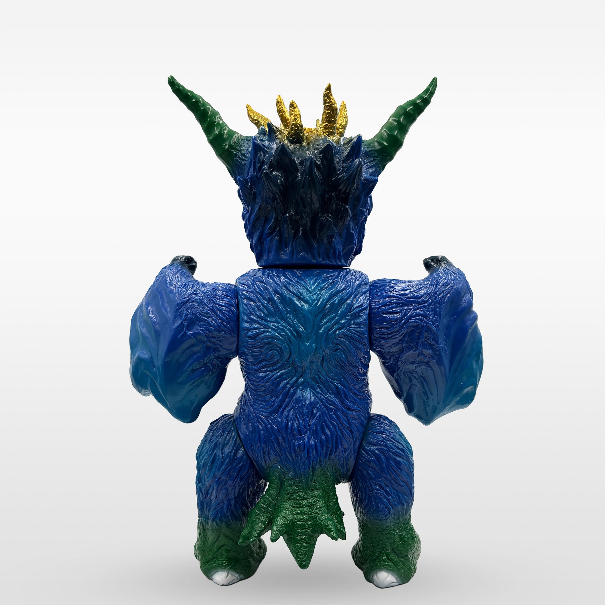塗装はKenth Toy Worksが担当。青の成型色をベースに、ブルーメタリックとネイビーを重ねたスプレーワークで、色に深みと奥行きを加えています。頭部は筆塗りによって仕上げられており、量産ソフビとしては非常に細かな表現に挑戦した仕様です。