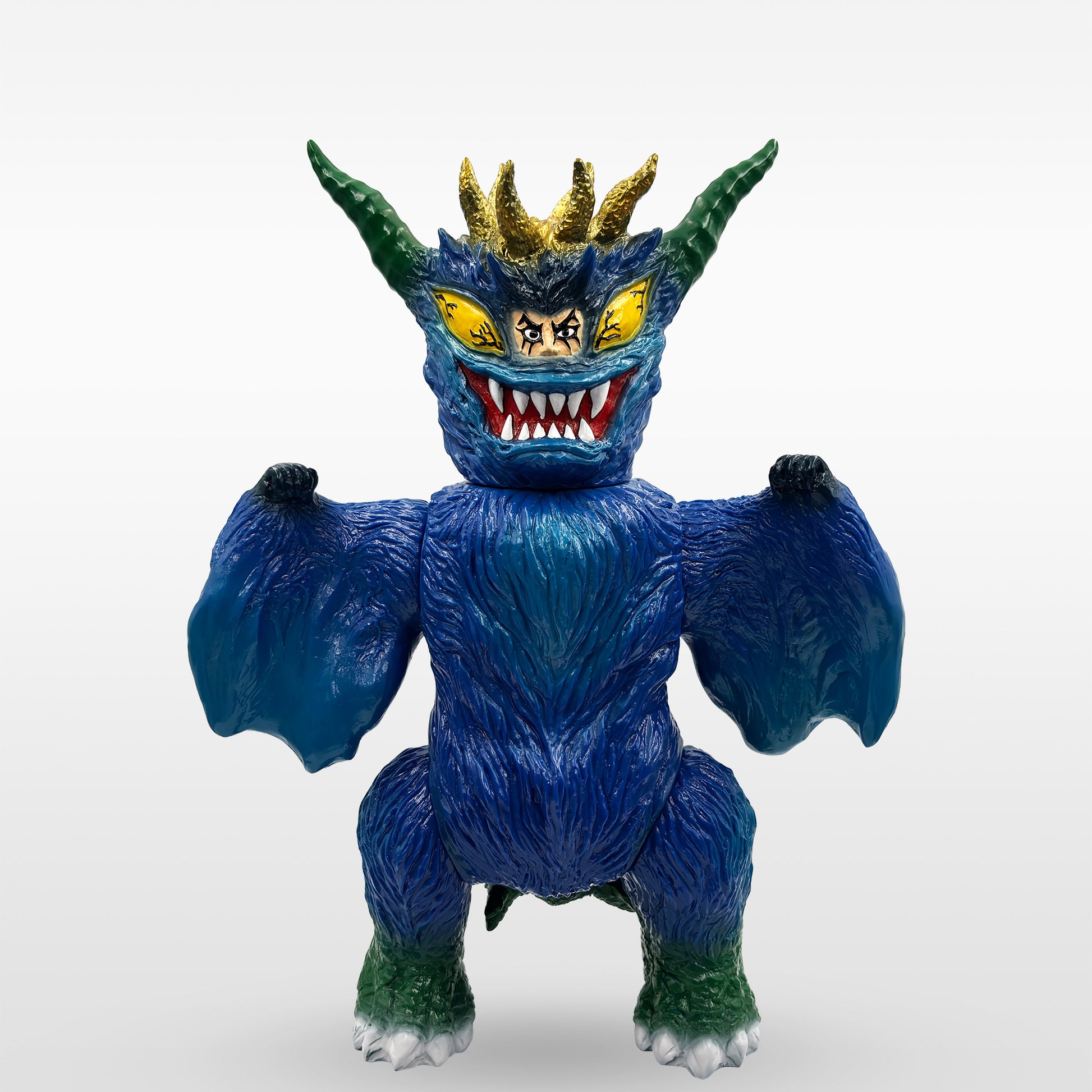 魔王ダンテは、大きな翼と3本の長い尻尾という特徴を、昭和レトロソフビらしいデフォルメを加えて造形。懐かしさを感じさせるフォルムの中に、体毛や羽、手足の質感を細かく作り込み、立体感のある仕上がりにしています。