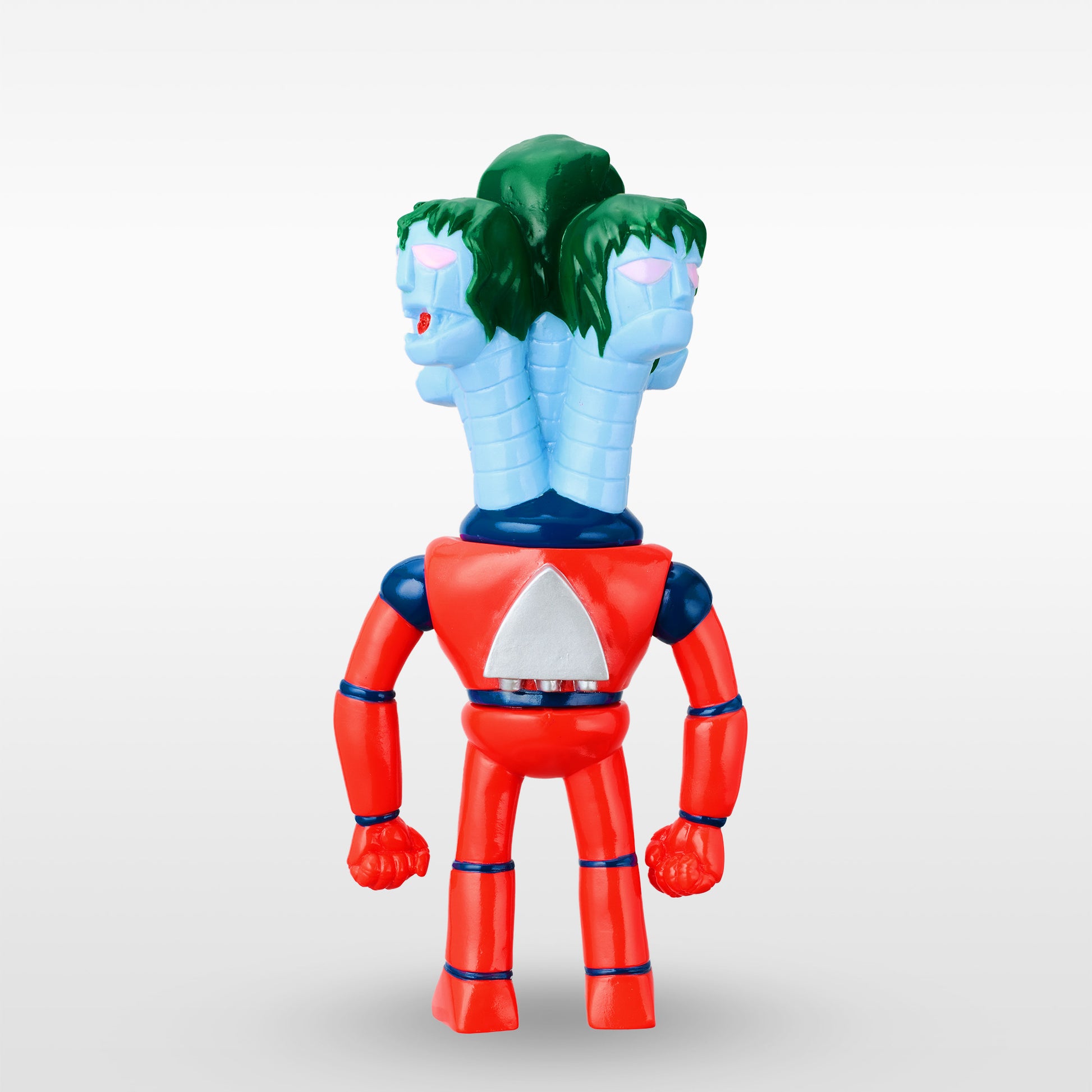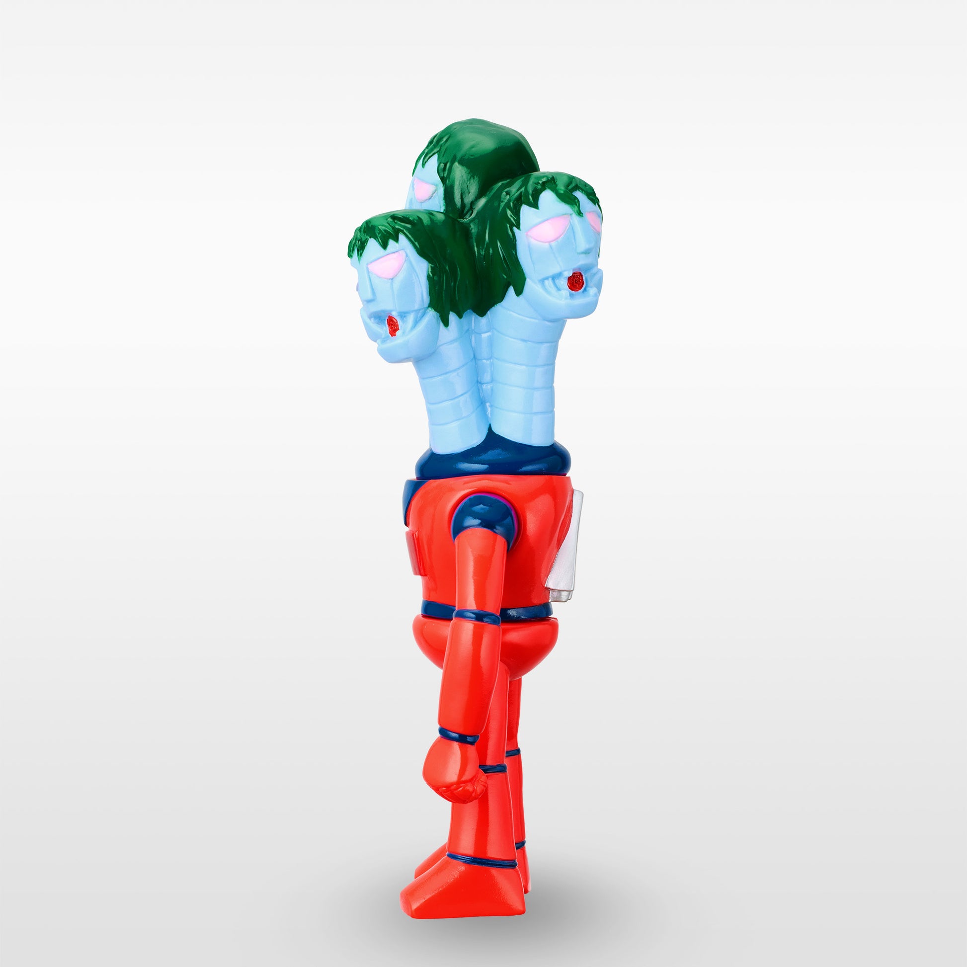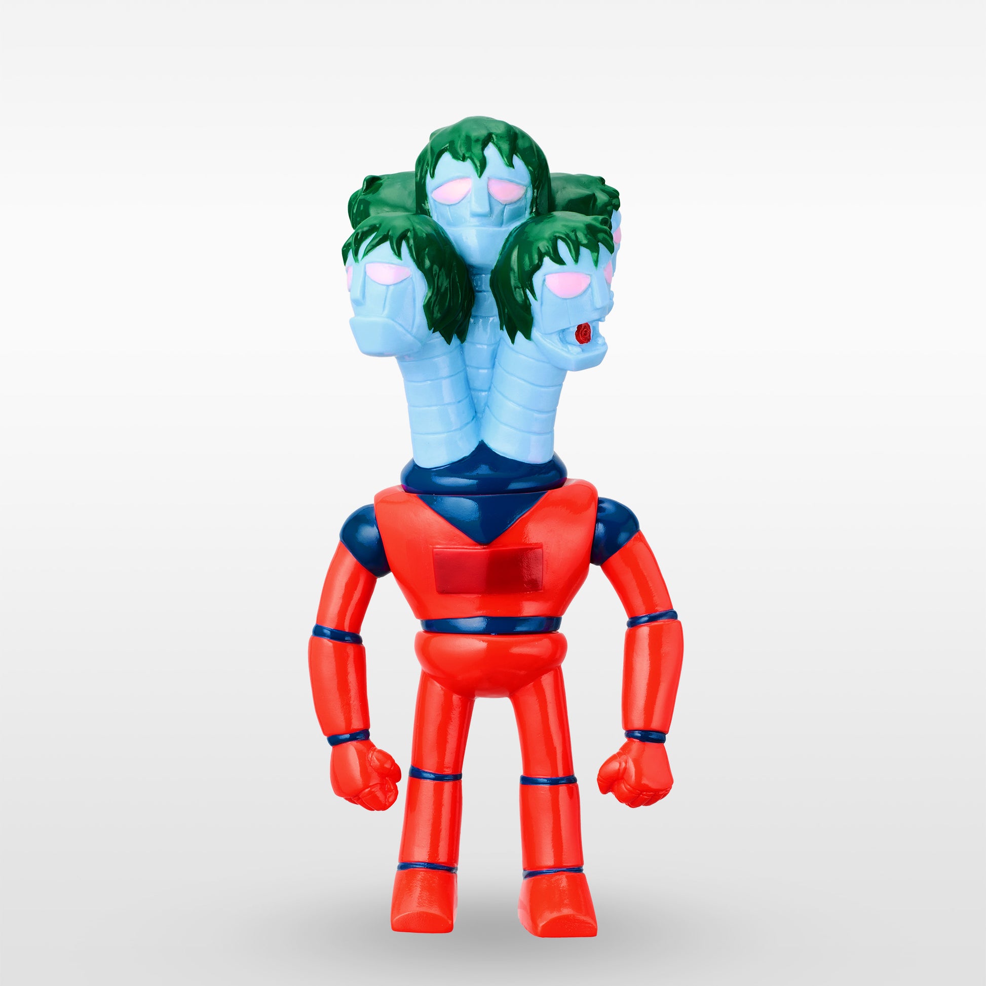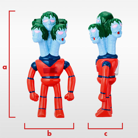 ソフビらしいディフォルメによって5つの頭と首を1パーツで表現しました。